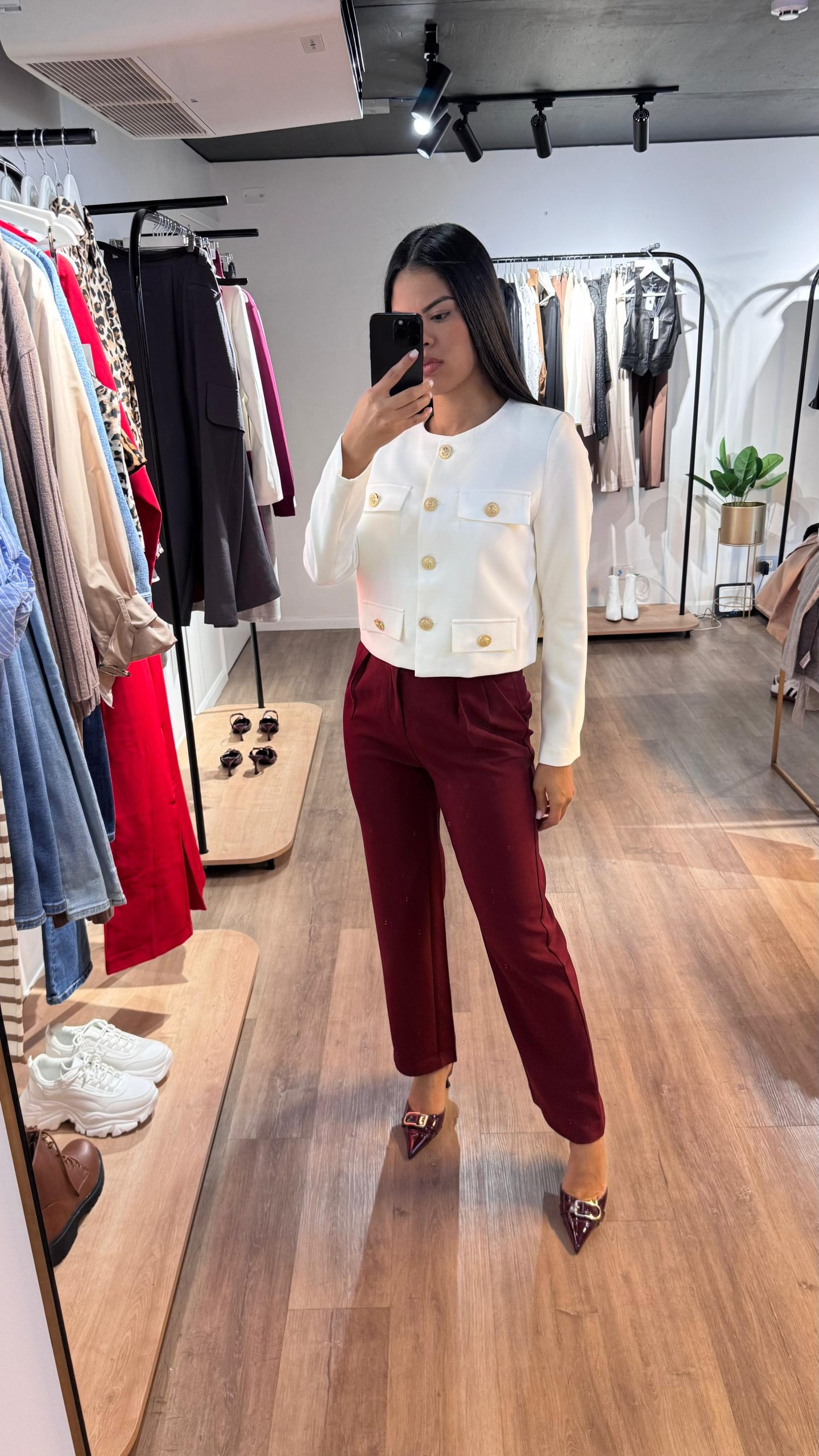 Pantalón tela en color burdeo sin elasticidad  Las tallas son horma completa y como referencia la modelo está usando talla S y sus medidas son: altura 1,67 cm, busto 85,5 cm, cintura 64,5 cm, cadera 95 cm